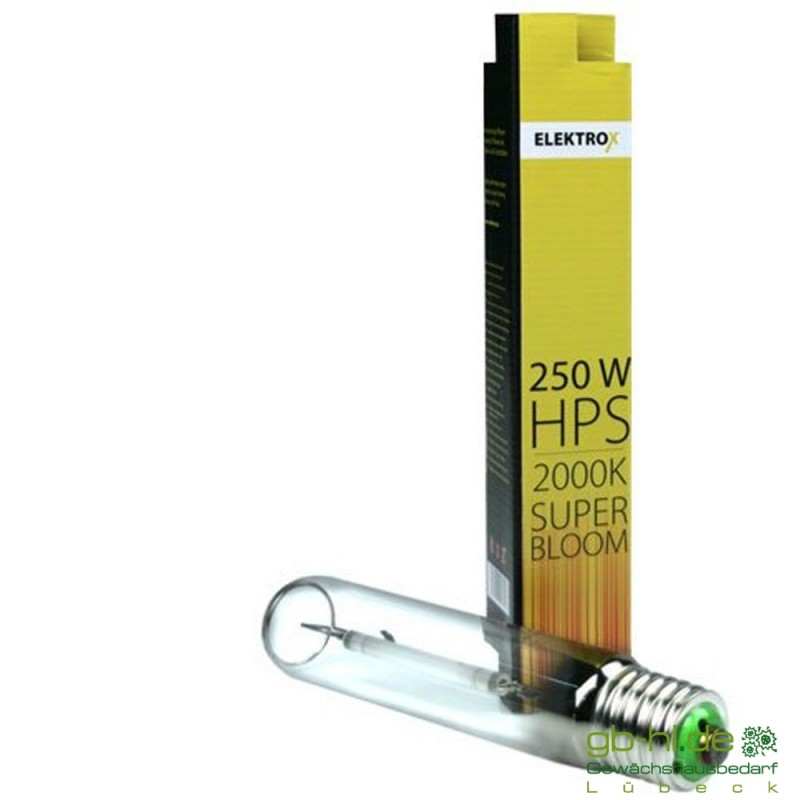 Diese Natriumdampf-Hochdrucklampe hat eine Lichtstärke von 32500 lm mit einer Lichteffizienz von 130 lm / W. Der Vorteil gegenüber LED-Technik und Energiesparleuchten besteht in der größeren Ausleuchtungsfläche und -tiefe. Mit seiner Farbtemperatur von 2000 K, der warmweißen Lichtfarbe und dem gelb-roten Farbspektrum fördert die Elektrox SUPER BLOOM 250 W HPS besonders die Blütenbildung von Pflanzen.