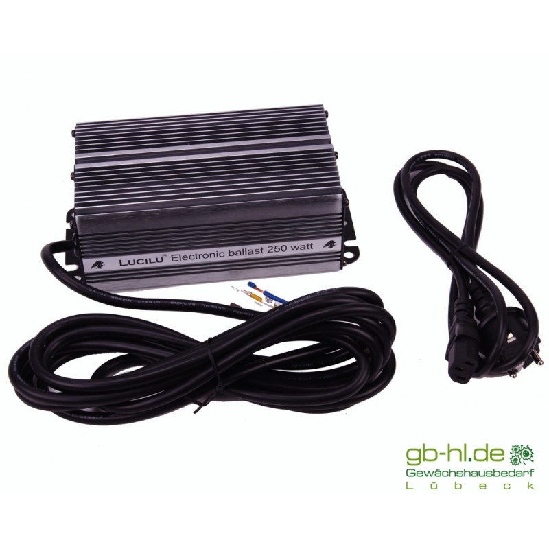 Mit einer Feinsicherung, einem 1,4 m langem Netzanschlusskabel sowie einem 4 m langem Verbindungskabel zum Anschluss des Reflektors ist das LUCILU elektronisches Vorschaltgerät voll ausgestattet. Es agiert nahezu brummfrei, weiche Gummifüße sorgen für einen sicheren Stand und dämpfen die letzten Vibrationen für einen ruhigen Betrieb. Das aufwändige Gehäuse aus Aluminiumstrangpressprofil birgt neben den langen und effizienten Kühlrippen auch eine Mutternschiene zur hängenden Befestigung.